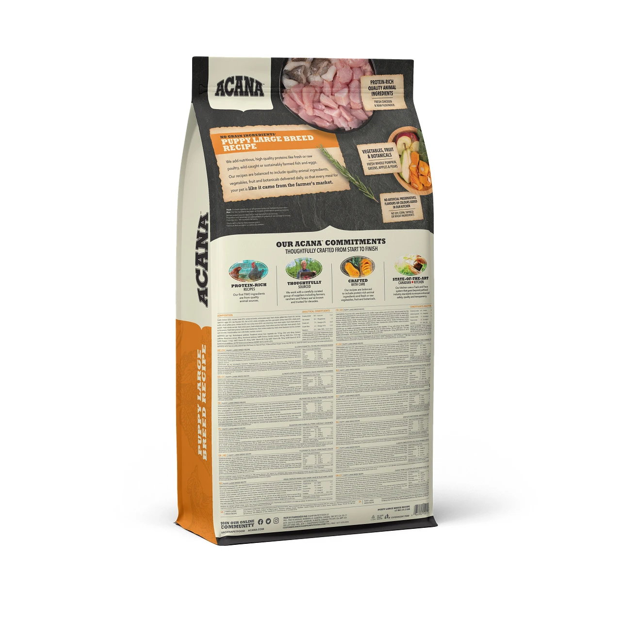 Als het gaat om ACANA® hondenvoer, is elk ingrediënt belangrijk. Daarom is ons Puppy Large Breed-recept zorgvuldig samengesteld om opgroeiende puppy’s van alle rassen te voeden. Dit recept is rijk aan dierlijke ingrediënten van 70% kwaliteit, zoals verse Canadese kip en rauwe bot, uitgebalanceerd met 30% fruit, groenten en plantaardige ingrediënten.
