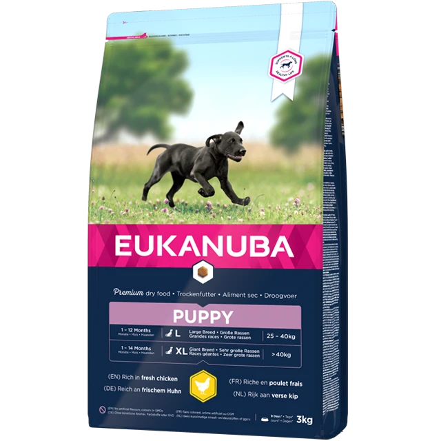 EUKANUBA’s beste puppyvoer voor grote rassen, aanbevolen voor grote honden zoals Duitse herders, labradors, rottweilers en golden retrievers. Omdat puppy’s van grote rassen zo snel groeien, is dit hondenvoer ontwikkeld met speciaal afgestemde hoeveelheden energie, calcium en fosfor voor de optimale groei van botten en gewrichten. Ook bevat deze voeding een optimale verhouding van omega 6- en omega 3-vetzuren voor een gezonde huid en een glanzende vacht voor je pup, en dierlijke eiwitten (kip is het belangrijkste bestandsdeel) die helpen bij de ontwikkeling van sterke, soepele spieren. Van de DHA is bovendien klinisch bewezen dat deze helpt bij de ontwikkeling van slimme, goed te trainen puppy’s. EUKANUBA Puppy droge hondenvoeding voor grote rassen is ontwikkeld in samenwerking met dierenartsen. Het bevat 100% van de nodige voedingsstoffen en is helemaal uitgebalanceerd om jouw pup gezond te helpen groeien.