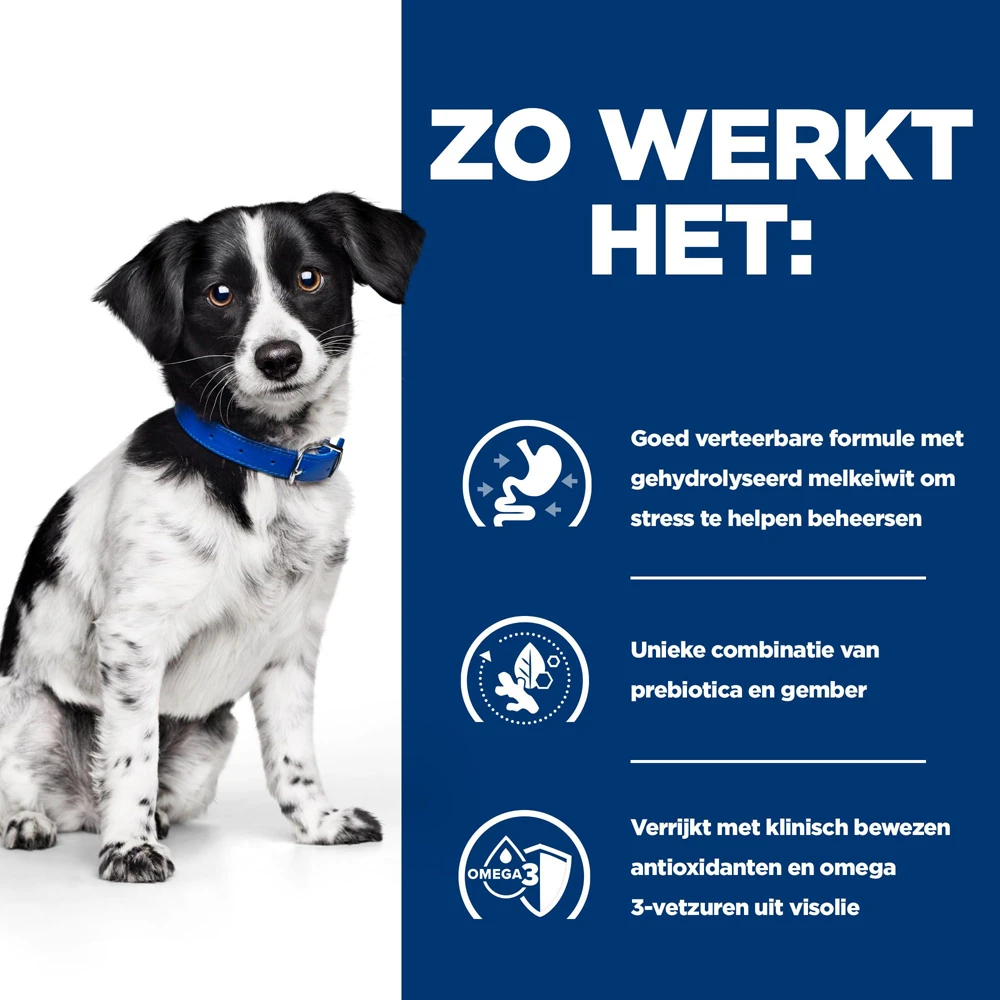 Hill’s voedingsdeskundigen en dierenartsen hebben Hill’s Prescription Diet i/d Stress Droog hondenvoer ontwikkeld dat speciaal is samengesteld om stressgerelateerd gedrag, waaronder spijsverteringsproblemen, bij honden tot 14 kg te helpen beheersen.