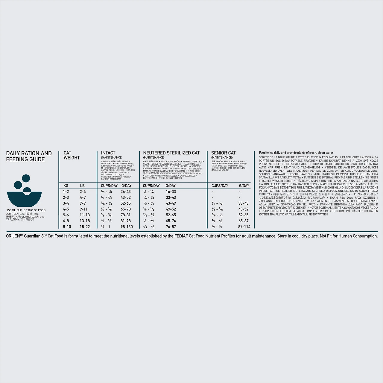 ORIJEN® Guardian 8 is een voedzame voeding die speciaal is samengesteld om 8 veelvoorkomende kwaaltjes bij katten aan te pakken door middel van hoogwaardige ingrediënten. Vanwege de overvloed aan verse en rauwe dierlijke ingrediënten van WholePrey in dit dieet, zijn er minder summplementen nodig om de gezondheid van je kat een leven lang te ondersteunen. Met 90%* hoogwaardige dierlijke ingrediënten, en 2/3 daarvan vers en rauw, bevat Guardian 8 voedzame ingrediënten die de algehele gezondheid van je kat ondersteunen met 8 voordelen.