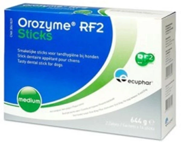 Orozyme RF2 Sticks hebben, naast een mechanische functie, de specifieke eigenschap dat de biofilm die zich op de tanden vormt afgebroken wordt. Deze biofilm is een voorloper van tandsteen. Zo wordt de vorming van tandsteen voorkomen.